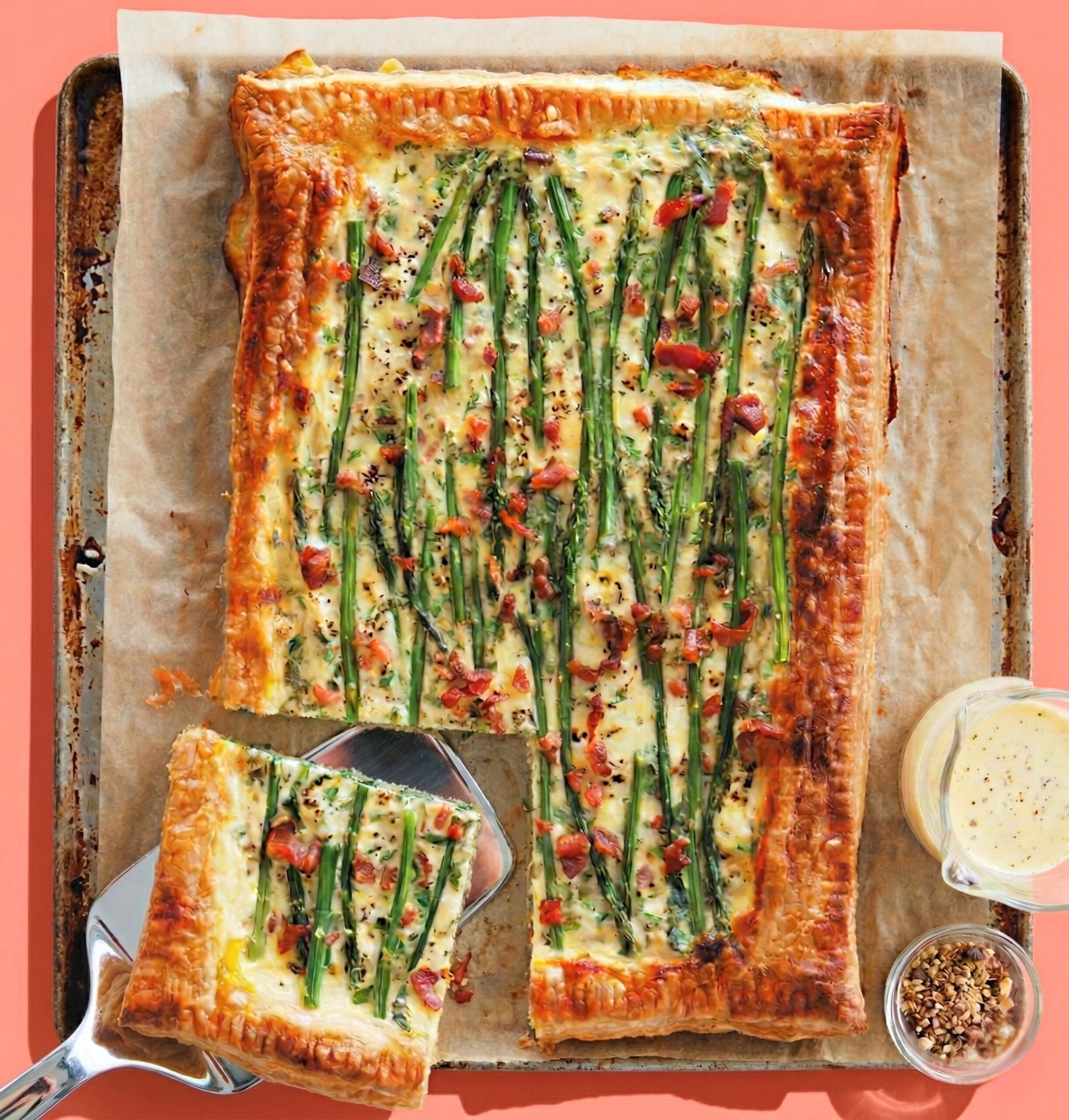 This savory recipe is the perfect elegant addition to a spring brunch or light dinner menu. Featuring a buttery, flaky puff pastry base, this dish combines tender-crisp asparagus spears with the smoky, salty crunch of crumbled Greer’s Ranch House bacon. We love how this approachable combination of flavors is not only visually stunning but also one of our favorite ways to showcase our best finds from that morning’s trip to the farmer’s market.